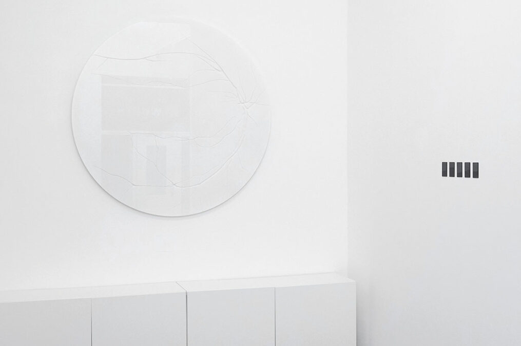 I’ve already explained the Tomorrow panels—the daily “Tomorrow I will…” sentences. It was important to me to show them in a representative way, to give a sense of continuity. Many of my works function like ongoing construction sites: something I work on daily. The three disk works shown here were developed specifically for space and have never been exhibited before. I actually saw them completed for the first time in the room of the gallery; before that, I’d only seen them in the workshop among machines. All works deal with mediated seeing: lenses, instruments, and the distance between them. One work refers to a telescope, another to a microscope, and another to the ophthalmological instrument used to examine the retina, the interface where images enter the brain.