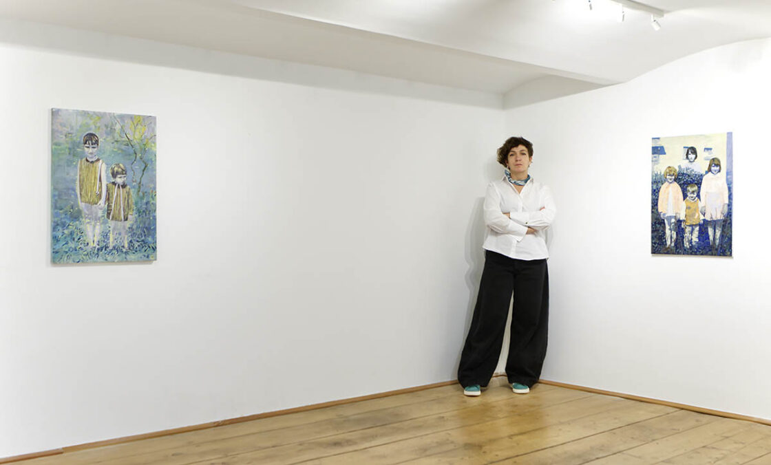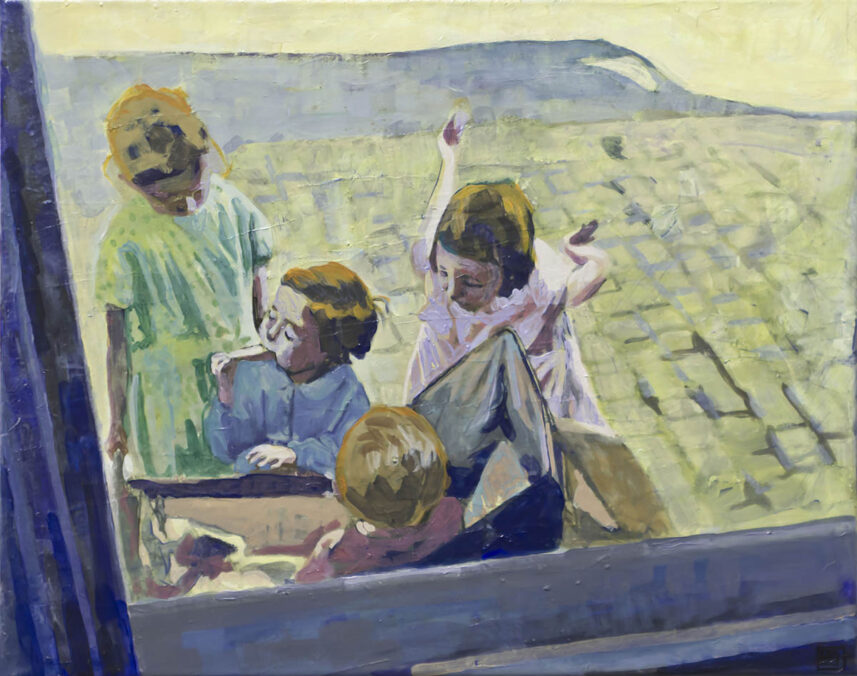 Being a mother and being part of a family where my siblings also have children, I have been surrounded by children all my grown-up life. I already depicted them in my “children’s series,” but I also touched on the story of the past communist time. For example, in the painting „Family Bunker“, I paint three of our children sitting on top of a bunker. Many families in Albania inherited bunkers on their land. But here is not about bunker inheritance; they symbolize the new generation holding the past trauma, like a bunker inside us. That is why the parts came: each country, each archive, each history asked for its own chapter.