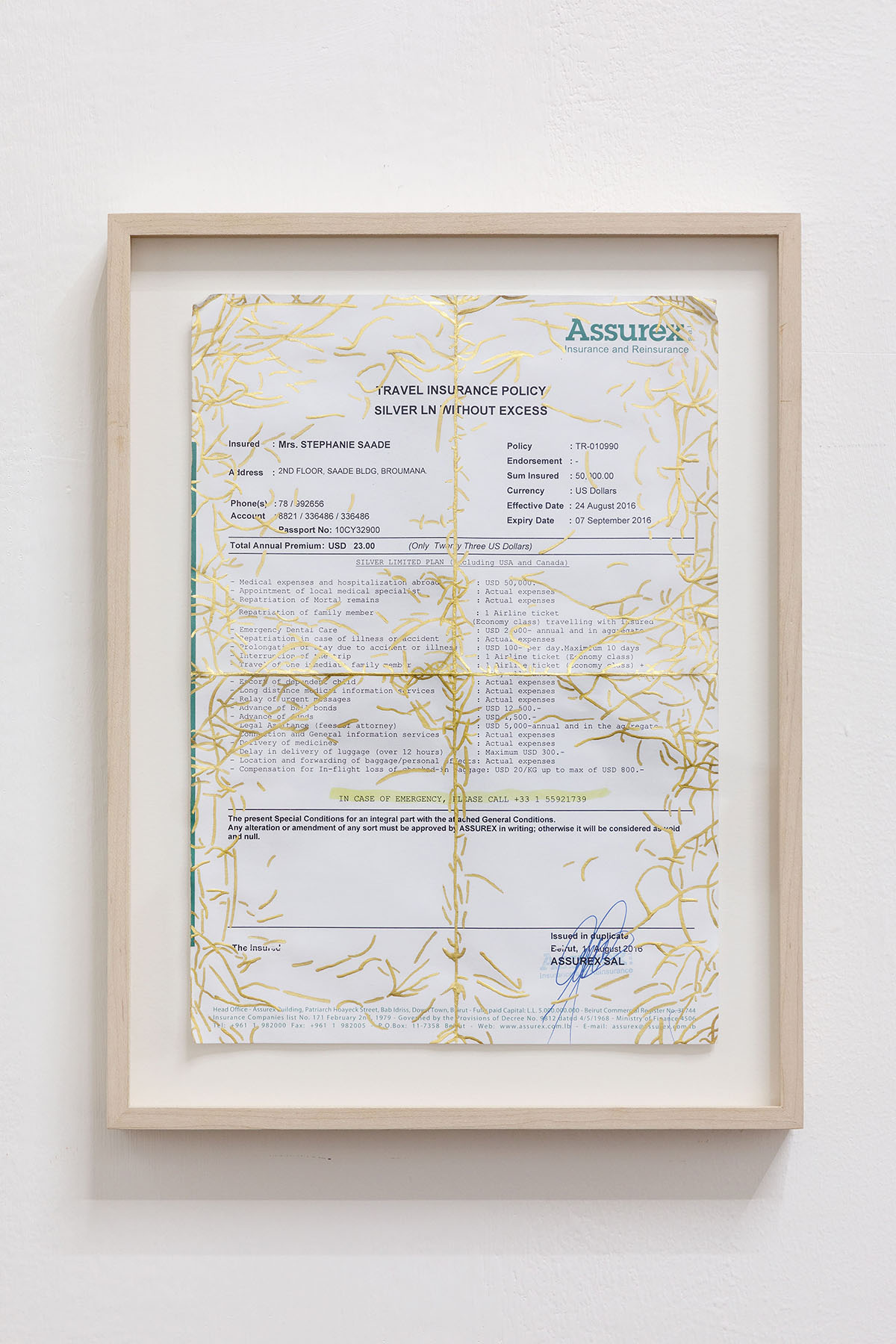 SS: The works presented in the show actually correspond to three distinct temporalities. The first period ranges from 2014 to 2019. During this time, I explored subjects such as my childhood in Lebanon. In Golden Memories (2014), a childhood photograph is entirely covered in 24-carat gold leaf. The actual memory is undocumented and lost in the process, yet instead of fading, the photographic paper acquires the qualities of gold: perennial and unchanging. The title carries an element of surprise and subtle irony, as these memories were “golden” despite taking place during the Lebanese Civil War. The process transforms the photographic image into an abstract monochrome surface, which becomes a mirror or screen for the public to project their own memories onto. Starting from a personal point of view, the work thus opens outward to engage others. Other works from this period include Mariage (2014), four fragments of keys welded together, uniting four unknown locations, which hangs as if indicating directions next to The Four Corners of the World (2016), a seemingly empty frame made from wood sourced from North, East, South, and West, following precise instructions given to a framer in a specific town and country. Travel Diaries (2014–2019) are travel documents marked by the creases formed during journeys, highlighted with 24-carat gold leaf – the most worn parts of these already valueless papers, again pointing to obsolescence like the postcard. Together, these works reflect my early preoccupations with orientation, travel, the properties of metals, and welding as a process that unifies while simultaneously sacrificing part of the individuality of each element.