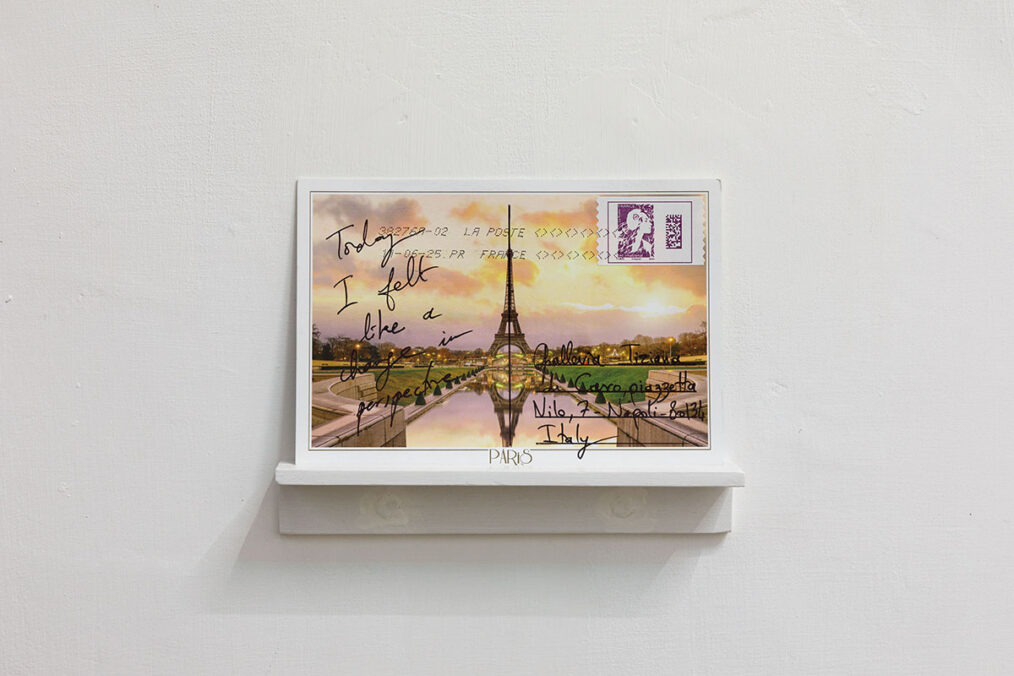 Stéphanie Saadé: Today I Felt Like a Change in Perspective is a postcard of the Eiffel Tower, sent from Paris, where I currently reside, to Galeria Tiziana di Caro in Napoli. It reads: “Today I felt like a change in perspective.” Unusually, the sentence, address, stamp, and postmark appear on the image side rather than on the back. The Paris post office agreed to play along, and the card was delivered successfully despite its unconventional use. Written in a moment of introspection, the sentence gains another layer of meaning in the exhibition context: through the show and the works presented, the public is invited to shift their perspective as well. Each time, I choose a postcard depicting a symbol of the city. Here, perhaps the most iconic: the Eiffel Tower. This emphasizes the obsolete nature of the postcard as an object, which in this context finds a renewed potential use.