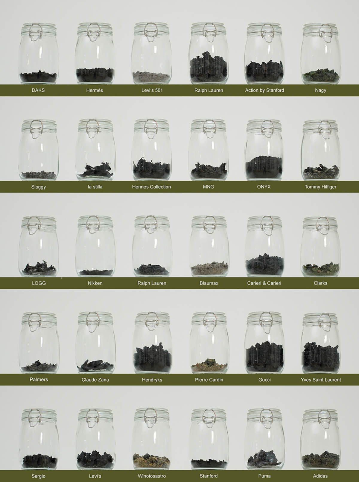 It actually started with me. I took off everything I was wearing for the full day, including shoes, socks, trousers, underwear, a shirt, and a pullover. Then I burned all the fabrics and placed each one in a separate glass container to create a kind of portrait of my surface, of how I appear. That was the first version of the work. Clothing interested me because they are a form of representation. The burned material remained, but the identity attached to it became more abstract.