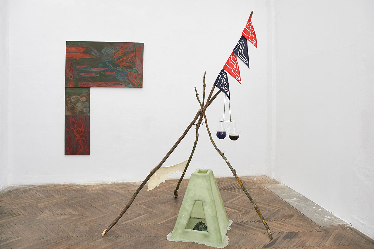Not so far away from Donaukanal, the space- new jörg presents a solo exhibition by Ádám Ulbert, with his research-driven practice, strongly influenced by ecology and science fiction. The moment you enter, the Scarecrow figure stands before you, with the mask made out of bronze and the body made out of wood, aluminum, textile, and goatskin. Wearing a bootleg T-shirt with the title of the show. “EDAPHON (A ( ELIKSR).“ The body that means to scare, or in this case, is there to remind us of nature around it. Above the door is the neon sign Deciphering the Entrance to the Entrails (2026), and steps lead into another room. The bronze frog is hidden under a latex-covered cage, the laboratory bottles hanging from the structure that simulates a prehistoric fireplace, and the flags are high and dyed in the batik technique. The scene of landscape, in the future or even already now. As a contrast to the installations, on the walls, silent oil paintings of the world on fire.